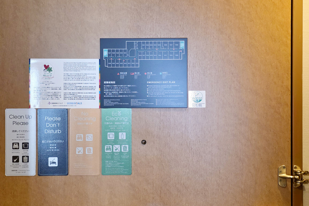 また、ドア裏の状況をご覧ください。 通常、ここには「清掃不要(Don’t Disturb)」や「エコ清掃」などのマグネットが貼られています。これらは運営上のツールであり、少し明るい色味やイラストが使われています。
