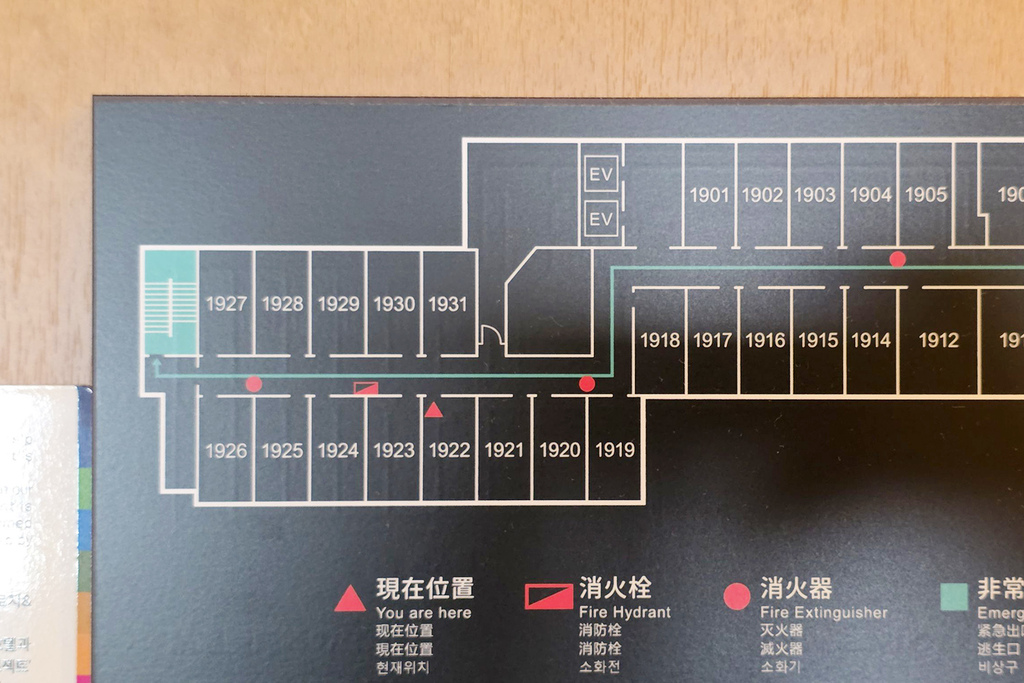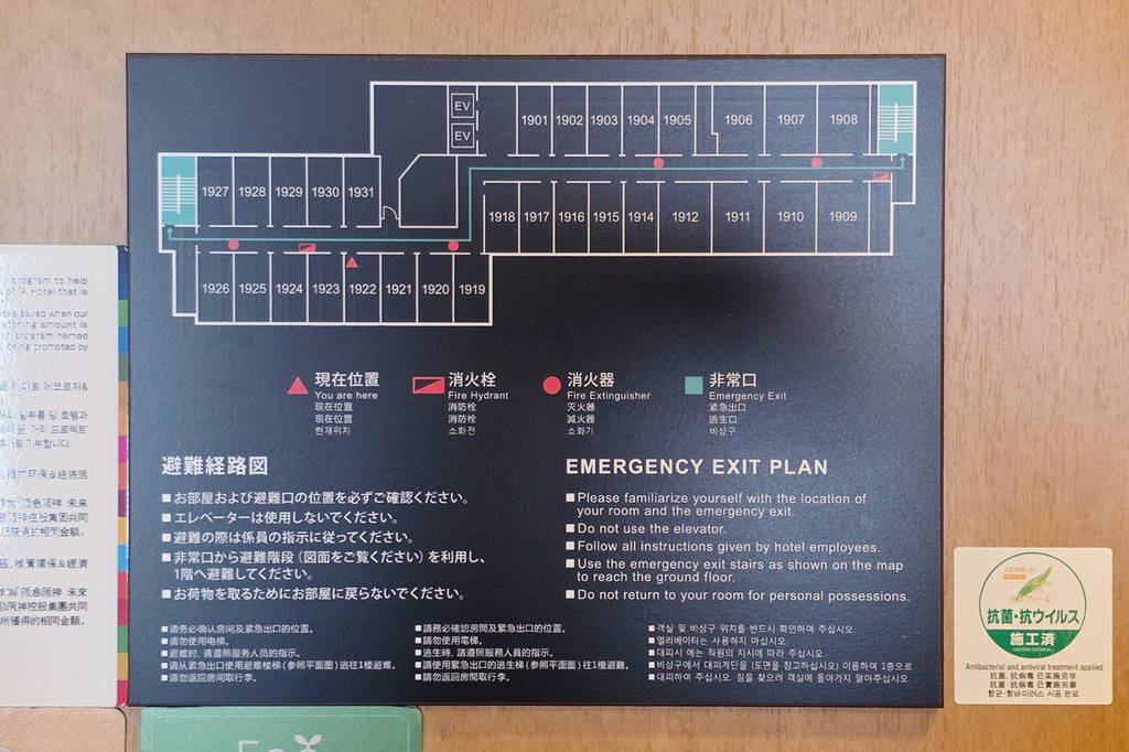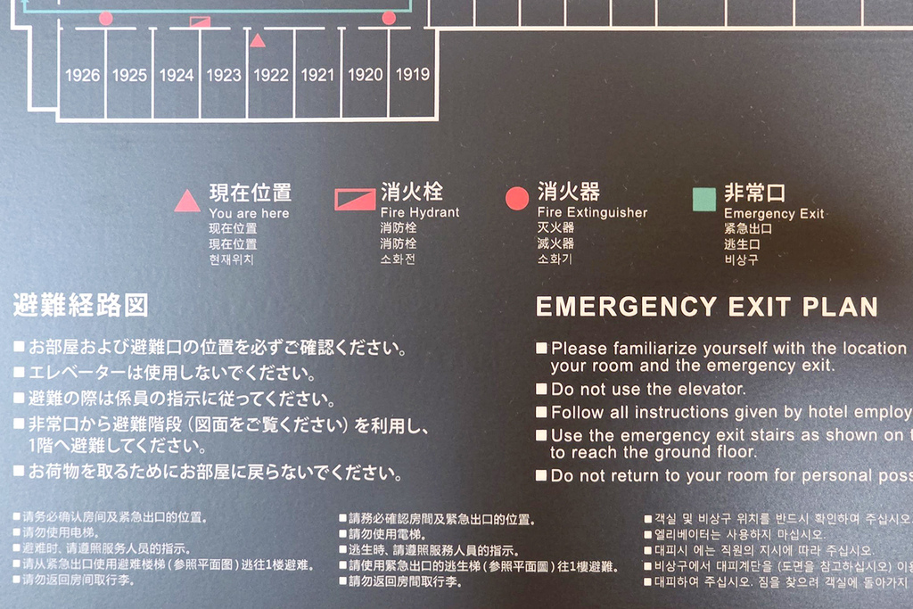 職業柄、プライベートな旅行中でもついつい「デザイン」に目が止まってしまいます。 特に気になるのが、宿泊先の客室ドア裏にある「避難経路図」。