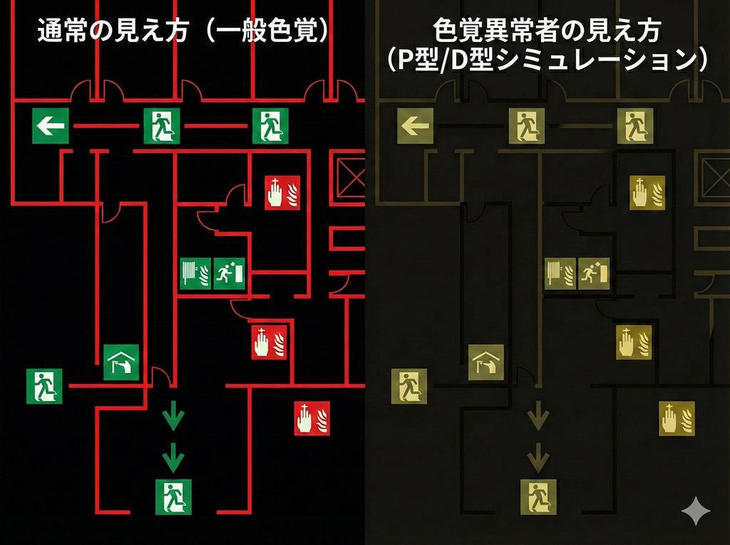 実は、この「黒背景に赤」や「黒背景に濃い緑」という組み合わせは、色覚多様性(色覚異常)を持つ方々にとっては非常に識別しにくい配色です。特に第1色覚(P型)の方にとって、暗い背景上の赤は黒く沈んで見え、ほとんど認識できなくなる恐れがあります。