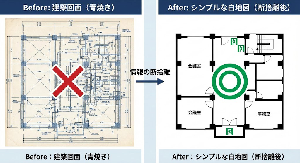 建築図面(青焼き)には、寸法線、柱の構造、配管など、避難者には不要なノイズが多すぎます。