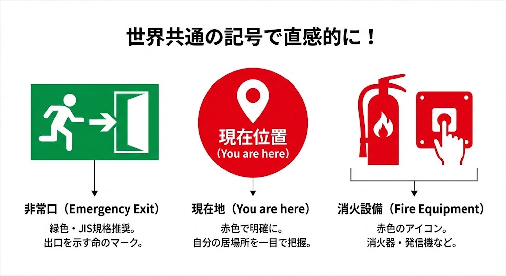 緊急時、文字を読む余裕はありません。世界共通の記号を使います。
