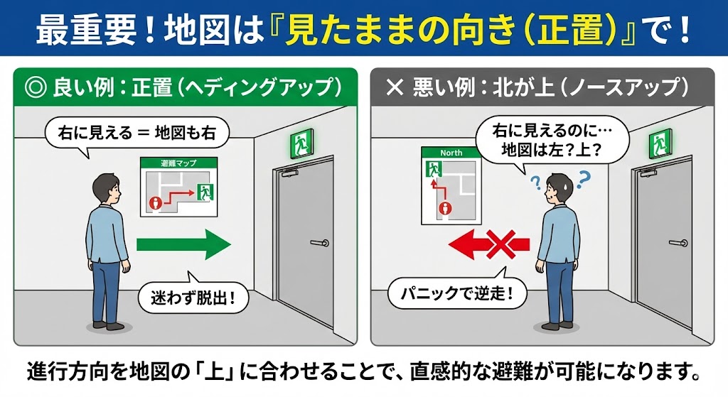 パニック時に「地図上の右」と「実際の右」が一致していないと、人は容易に逆走してしまいます。これを防ぐのが正置です。