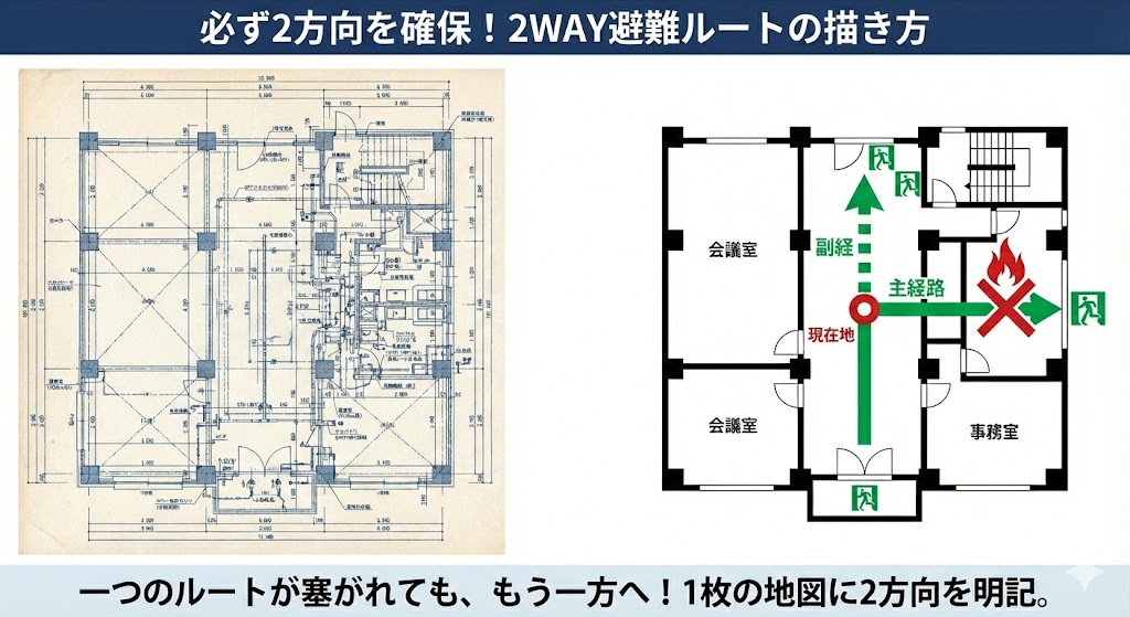 - 注意点:1つのルートが炎で塞がれることを想定し、必ず2方向(主経路と副経路)を記載してください。