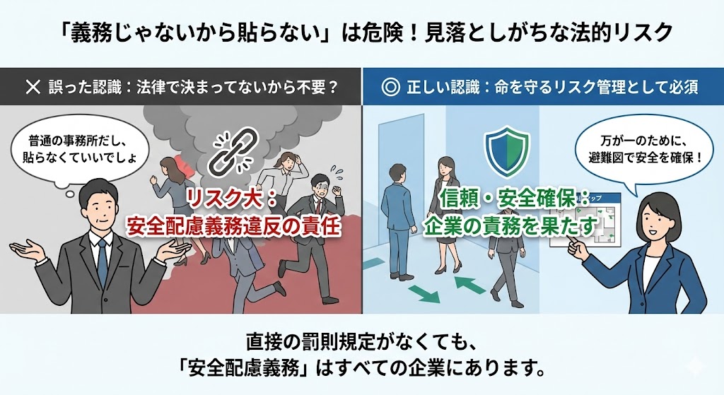 もし火災が発生し、避難経路がわからずに従業員や来客が逃げ遅れた場合、企業は「安全配慮義務違反」として法的責任を問われるリスクがあります。